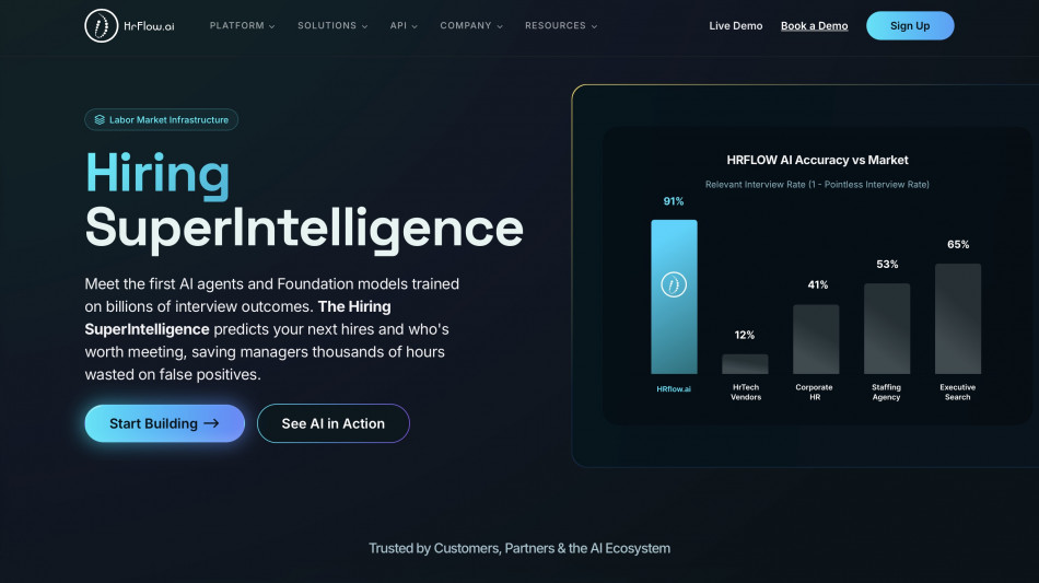 The API-first choice is self-evident because such a capability must not be confined to a single company, a single product, or a single interface. Like critical infrastructure, it should be made available to the entire labor market and the HR ecosystem: public employment services, large employers, staffing agencies, recruiting firms, RPOs, PEOs, ATS providers, job boards, HCM platforms, and HRIS vendors. HrFlow.ai's mission is simple: build Hiring SuperIntelligence that helps the world reduce unemployment.
