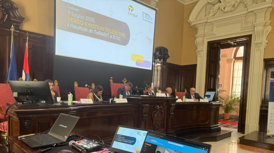 Due progetti fondamentali per il sistema italiano della ricerca che hanno reso la Sardegna protagonista nel panorama nazionale ed europeo, un investimento complessivo di 91 milioni di euro con fondi Pnrr che in circa due anni ha dimostrato come il lavoro in sinergia tra istituzioni, comunità scientifica e università si traduca in risultati concreti. Si chiamano Terabit ed Etic le due infrastrutture di ricerca guidate dall'Istituto nazionale di Fisica nucleare per contribuire a sostenere la candidatura italiana ad ospitare a Lula, nella miniera di Sos Enattos, l'Einstein Telescope. Grazie a Terabit è stata realizzata l'espansione delle reti a fibra ottica creando un circuito iperveloce interno alla Sardegna e un collegamento via cavo sottomarino con l'Italia e il resto d'Europa. Etic, invece, ha consentito la creazione di laboratori di ricerca all'avanguardia in cui realizzare le infrastrutture tecnologiche e scientifiche necessarie per la realizzazione dell'interferometro di ET. I risultati dei due progetti sono stati presentati oggi nel rettorato dell'Università di Cagliari. Presenti, accanto al padrone di casa, il rettore Francesco Mola, la presidente della Regione Alessandra Todde, Roberto Cimino per il ministero dell'Università e della Ricerca, i vertici e gli esponenti di tutti gli enti coinvolti: l'Infn con il presidente Antonio Zoccoli collegato da remoto, il presidente del Garr (la rete telematica italiana per l'istruzione, la ricerca e la cultura), Maurizio Tira, e il presidente di Ogs (l'istituto nazionale di oceanografia e di geofisica sperimentale), Nicola Casagli. Il Terabit, forte di un investimento di 41 milioni di euro da fondi Pnrr, "ha potenziato la rete infrastrutturale a fibra ottica con un anello di circa 1.100 km su tutto il territorio della Sardegna e un collegamento con il continente. Questa infrastruttura - ha spiegato Tita - consente di aumentare di molto la potenzialità di calcolo, la trasmissione dei dati e la possibilità di accedere a risorse in tutto il Paese per fare calcoli avanzati". Michele Saba, direttore del dipartimento di Fisica dell'Università di Cagliari, ha raccontato le opportunità del secondo progetto, Etic, a cui lui stesso ha lavorato. Finanziato con 50 milioni di euro, sempre da fondi Pnrr, si sviluppa con dei laboratori all'avanguardia, inaugurati oggi, per testare le tecnologie fondamentali per la realizzazione dell'ET. "Quelle degli specchi dell'interferometro e quelle del monitor, del fronte d'onda - ha chiarito il ricercatore - Gli specchi sono una meraviglia della tecnologia, devono riflettere la luce con perdite di meno di una parte per milione. Nessuno li sa fare e quindi serve creare i laboratori per realizzare i prototipi, testarli e dimostrare che funzionino".